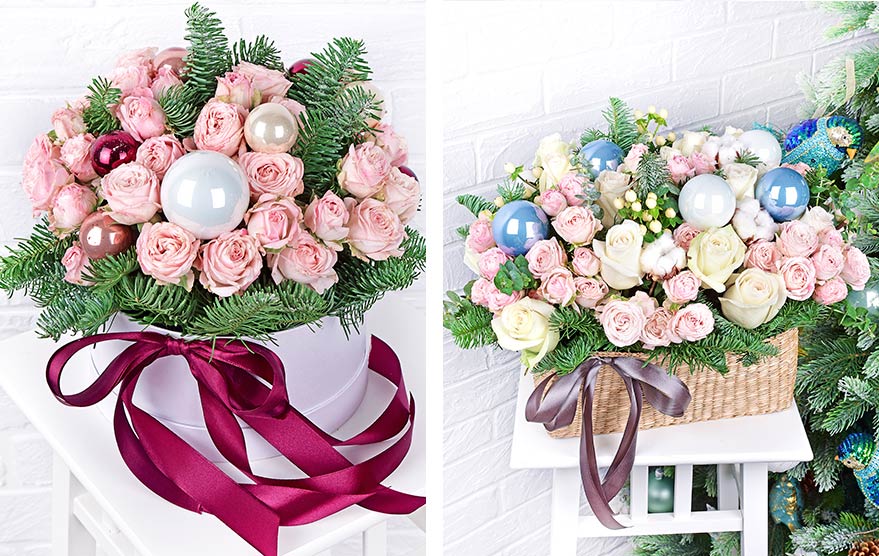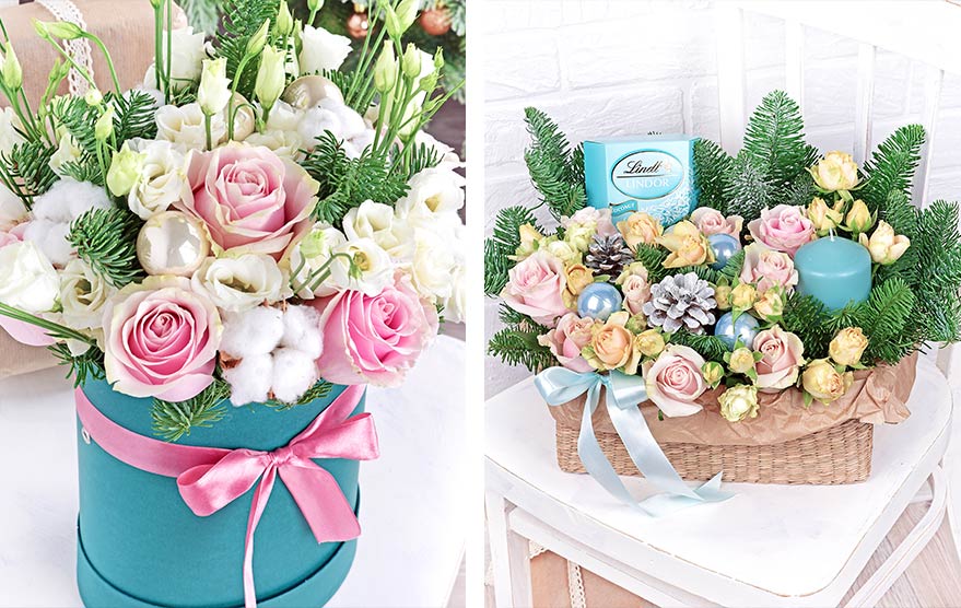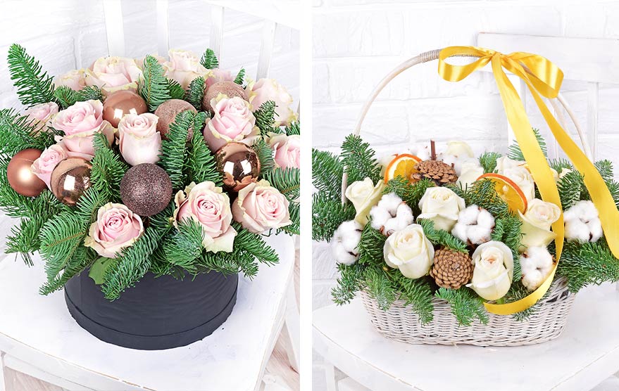 Прекрасно будут смотреться композиции из гербер и хризантем в шляпных коробках и корзинах с новогодним декором.