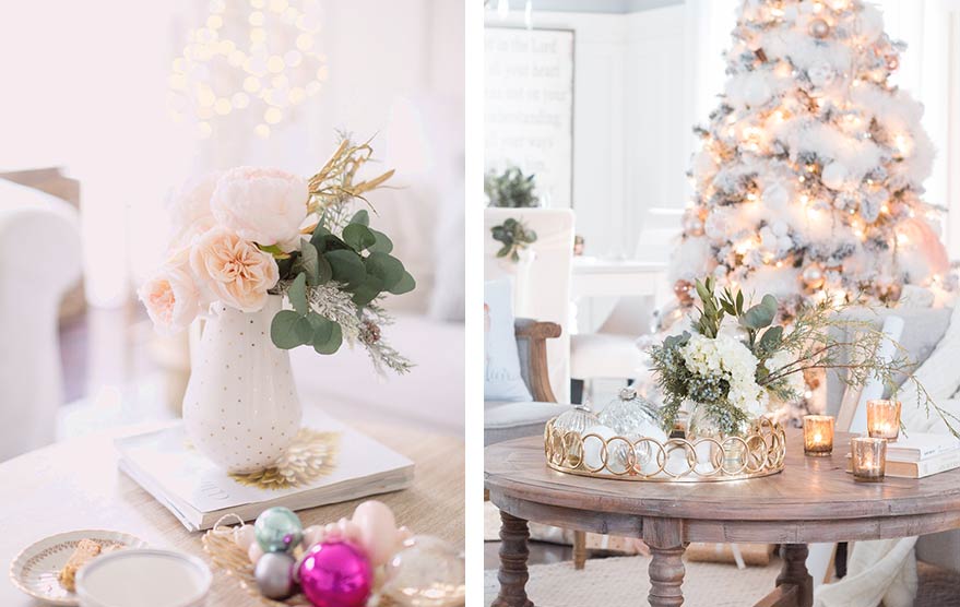 Удивите гостей, дополнив новогодний декор вашего дома композициями из цветов! Классические букеты из кремовых и белых роз вы можете разместить в стеклянных вазах, украшенных еловыми ветвями и шишками.
